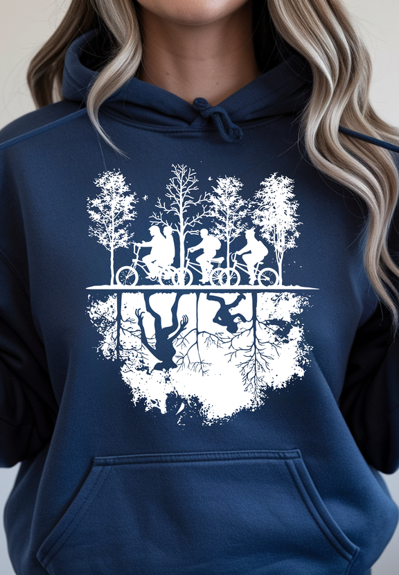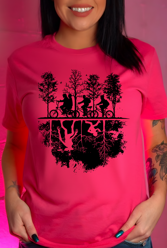 Step into the supernatural with a design that perfectly captures the duality of the Hawkins forest. This high-impact DTF Transfer features the iconic silhouette of a group of friends on their bikes, mirrored by the dark, tangled roots of a parallel dimension lurking just beneath the surface. It’s a clean, atmospheric tribute to 80s sci-fi nostalgia and the mystery of the unknown.