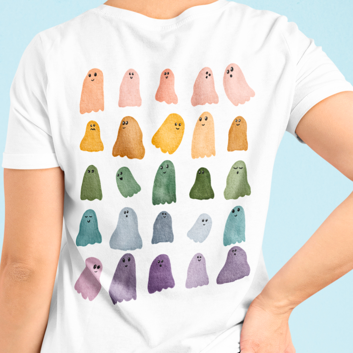 On the front, you'll find three adorable pastel watercolor ghosts in the pocket area, adding a subtle touch of Halloween spirit. Turn around, and you'll reveal a whole crew of charming pastel ghosts on the back, ready to spook in the sweetest way possible.
