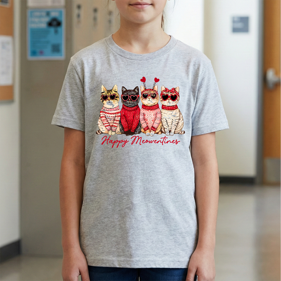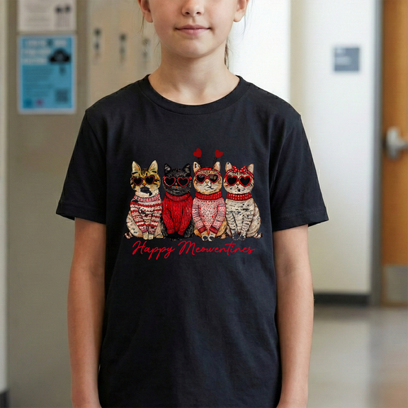 Introducing the Happy Meowentines DTF transfer. This isn't just a holiday graphic; it’s a lineup of the coolest cats to ever grace a garment. We’re talking about a squad of four elite operatives, each decked out in tactical knitwear (red and pink sweaters) and high-grade UV protection (heart-shaped sunglasses).