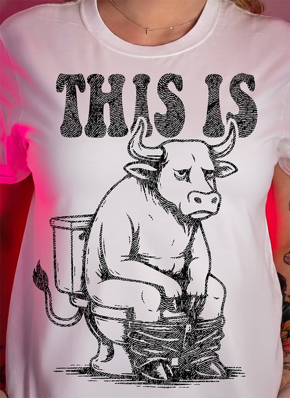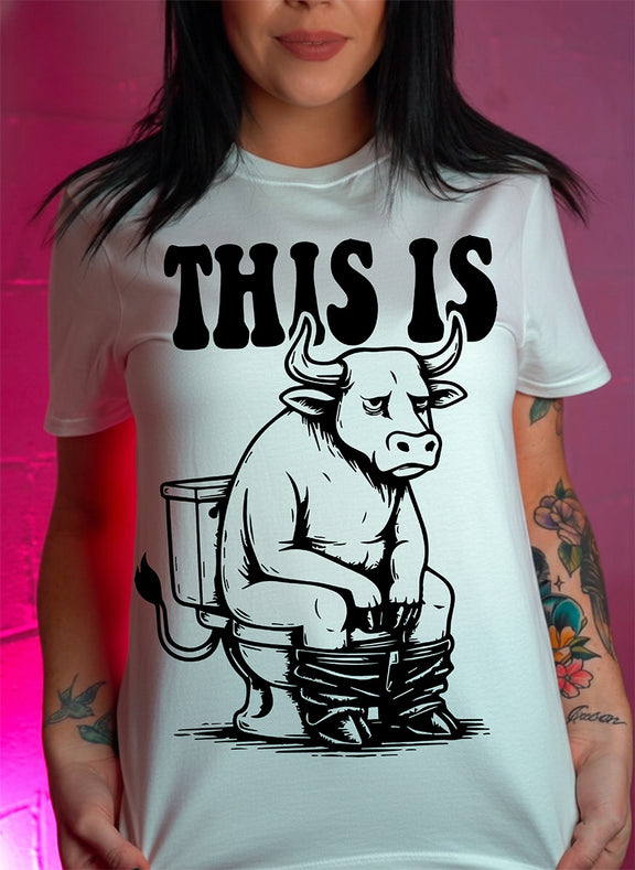 The Visual Pun: A clever, literal interpretation of the phrase "This is Bullsh*t," featuring a bull sitting on a toilet with its pants around its ankles.
