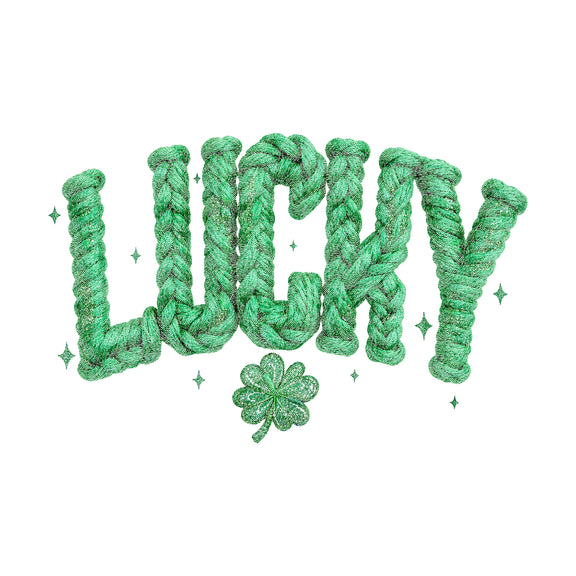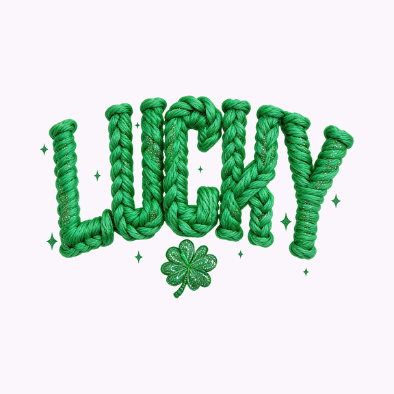 Bring a textured, artisan energy to your St. Patrick's Day lineup with this high-impact DTF Transfer. This unique design spells out a bold "LUCKY" using a meticulously rendered green braided rope and yarn texture, complete with embedded gold glitter accents. Topped off with a sparkling four-leaf clover and a scatter of magical green and pink twinkles, it’s the perfect blend of cozy craftsmanship and festive cheer that gives your products a truly custom, retail-ready feel.