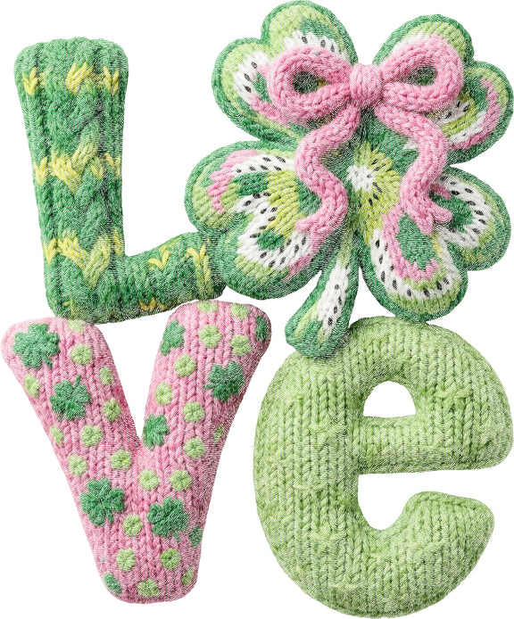 For the soul that loves a touch of texture and a whole lot of charm. This design features the word "Love" reimagined in a stunning 3D knitted effect, complete with intricate cable stitches and woven details. With a vibrant green four-leaf clover standing in for the "O"—topped with a delicate pink bow—and the "V" adorned with tiny knit shamrocks, it’s a masterpiece of digital craftsmanship. It’s warm, it’s whimsical, and it’s the perfect way to wear your Irish pride with a soft, boutique edge.