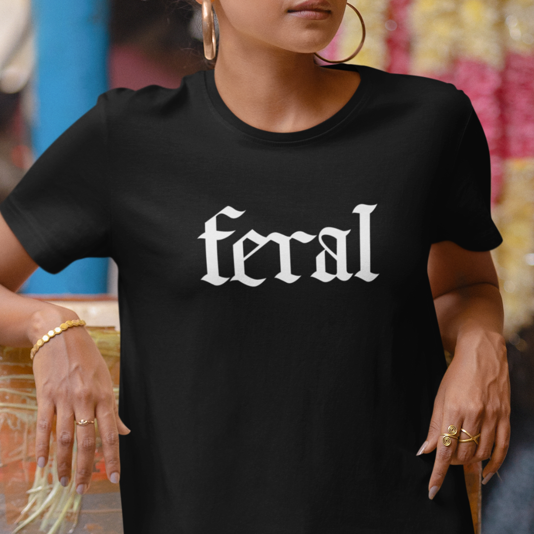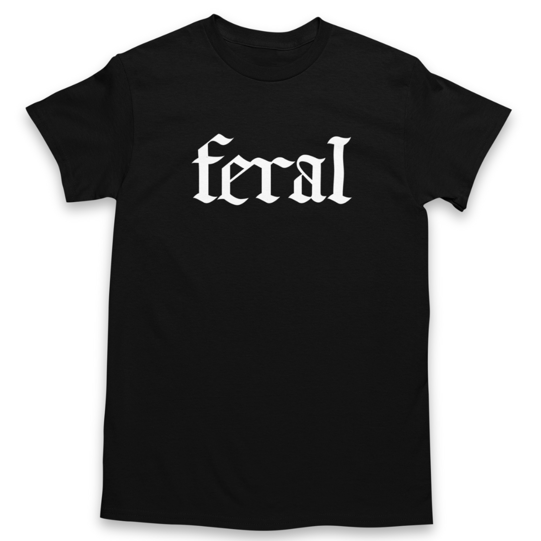 Featuring the word "Feral" in a bold, gothic style print, this tee is perfect for those who live life on their own terms and aren’t afraid to show it.