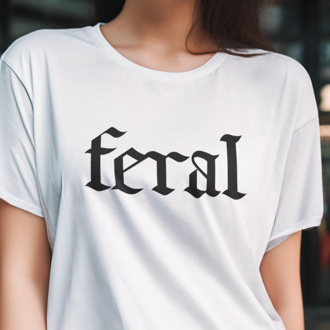 - Bold Gothic Design: "Feral" in gothic print makes a powerful statement that’s impossible to ignore.