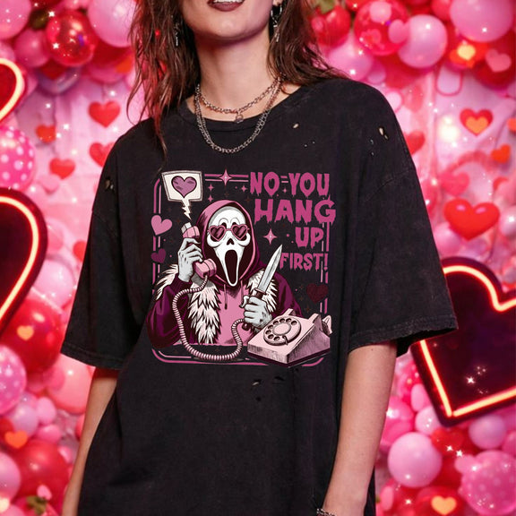 This “No, You Hang Up First” Horror Valentine DTF Transfer brings sarcastic dark humor straight to Valentine’s Day with a killer horror twist.