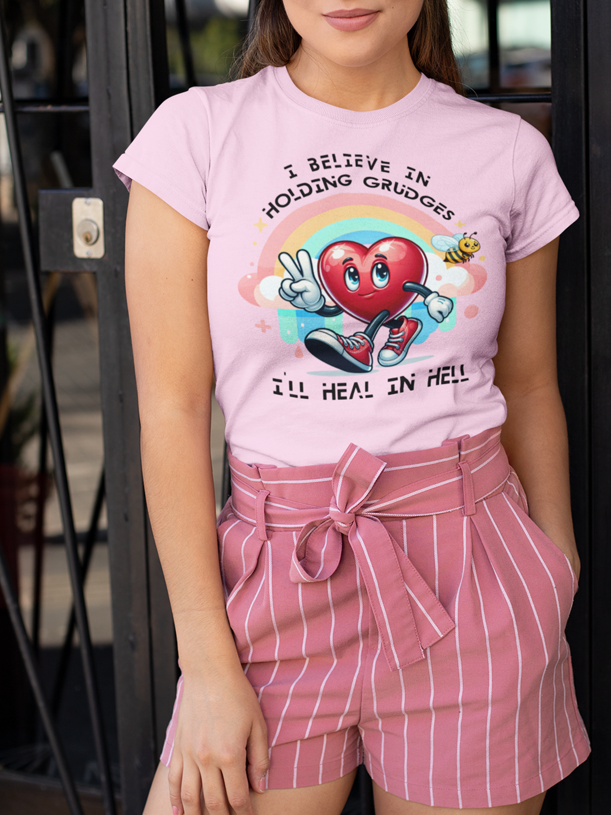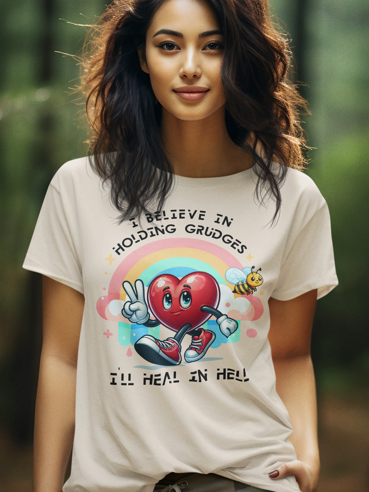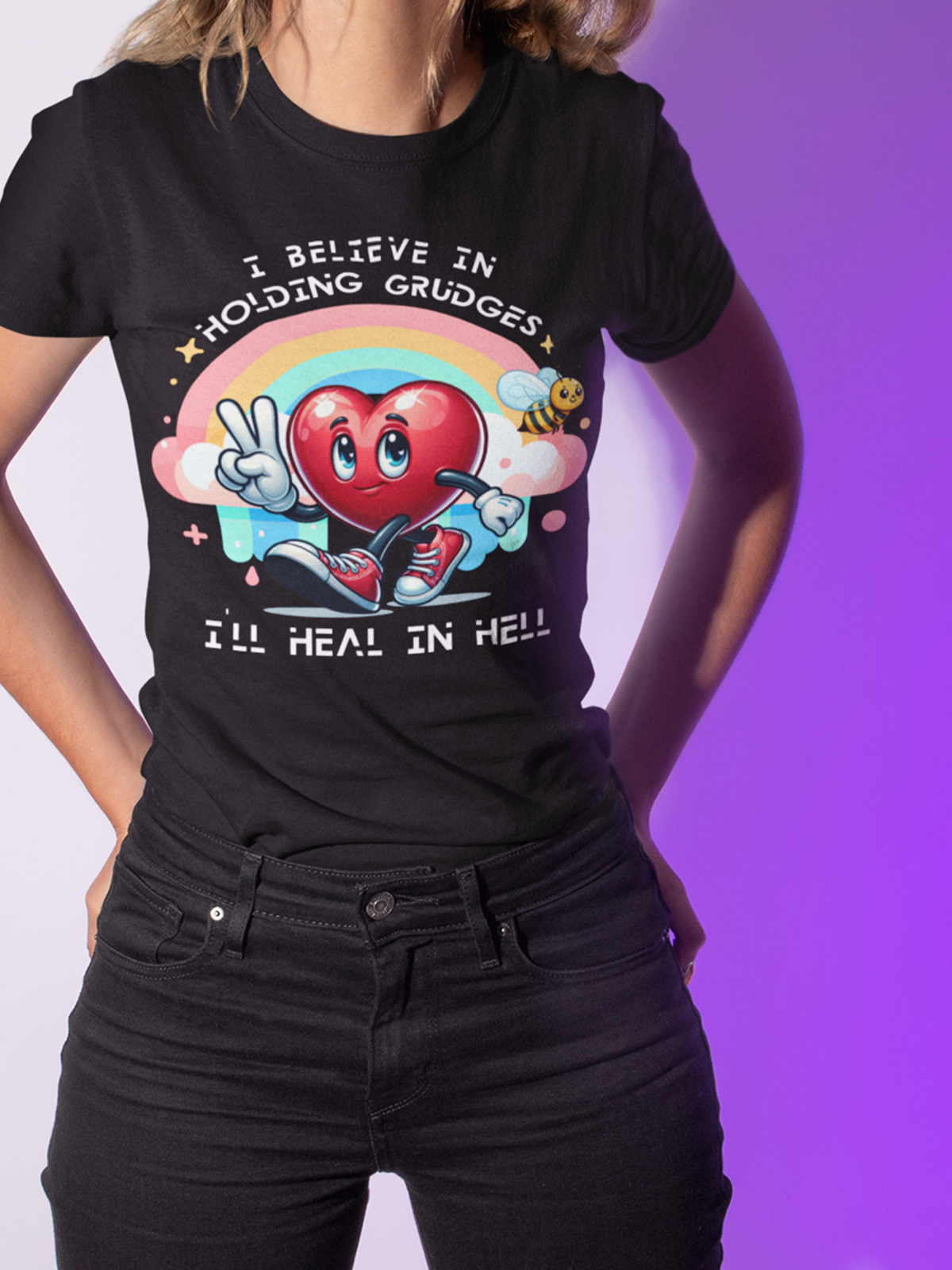 “I Believe in Holding Grudges. I’ll Heal in Hell.” - this isn’t just an attitude; it’s a promise. With a cartoon heart that’s too cool to care, a rainbow that dares to shine despite the shade, and a bee that’s all about the buzz, this shirt is for those who live life with a little sting in their step.