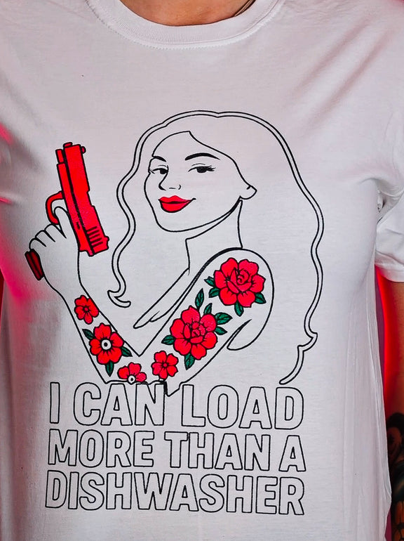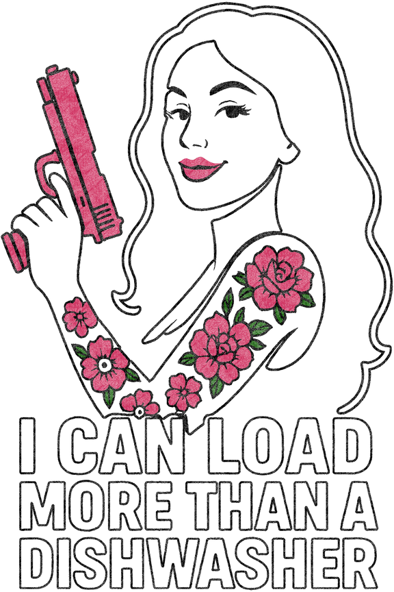 This I Can Load More Than a Dishwasher tee features a clean line-art style woman holding a gun, complete with red floral tattoo sleeves and a confident smirk. Itβs the perfect mix of girly and badass β a design that gets attention every time.