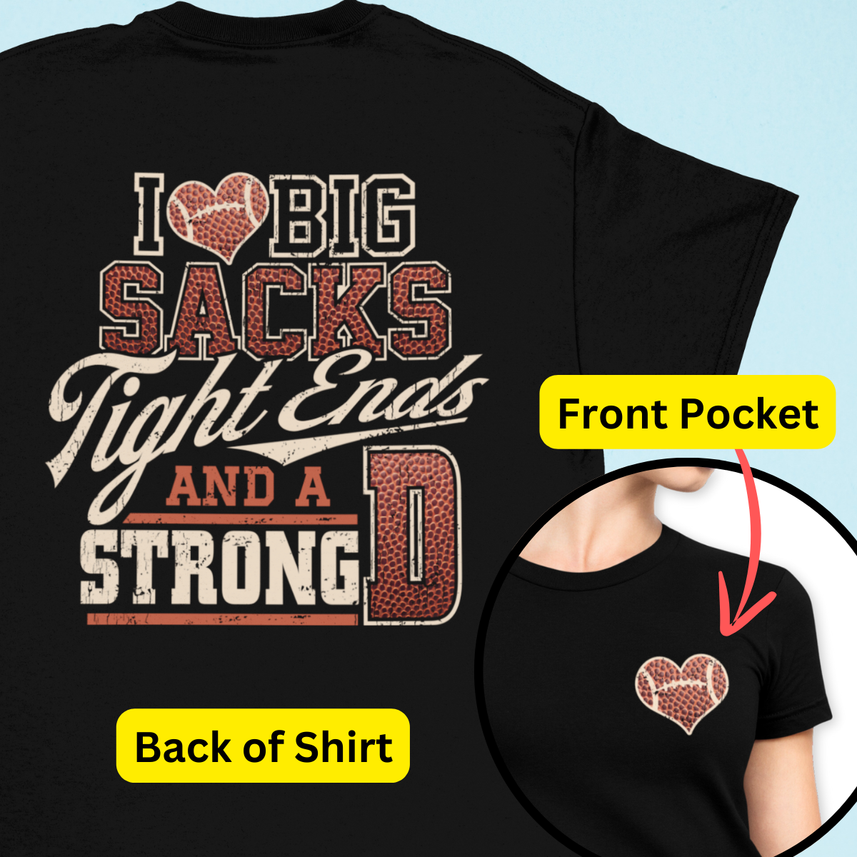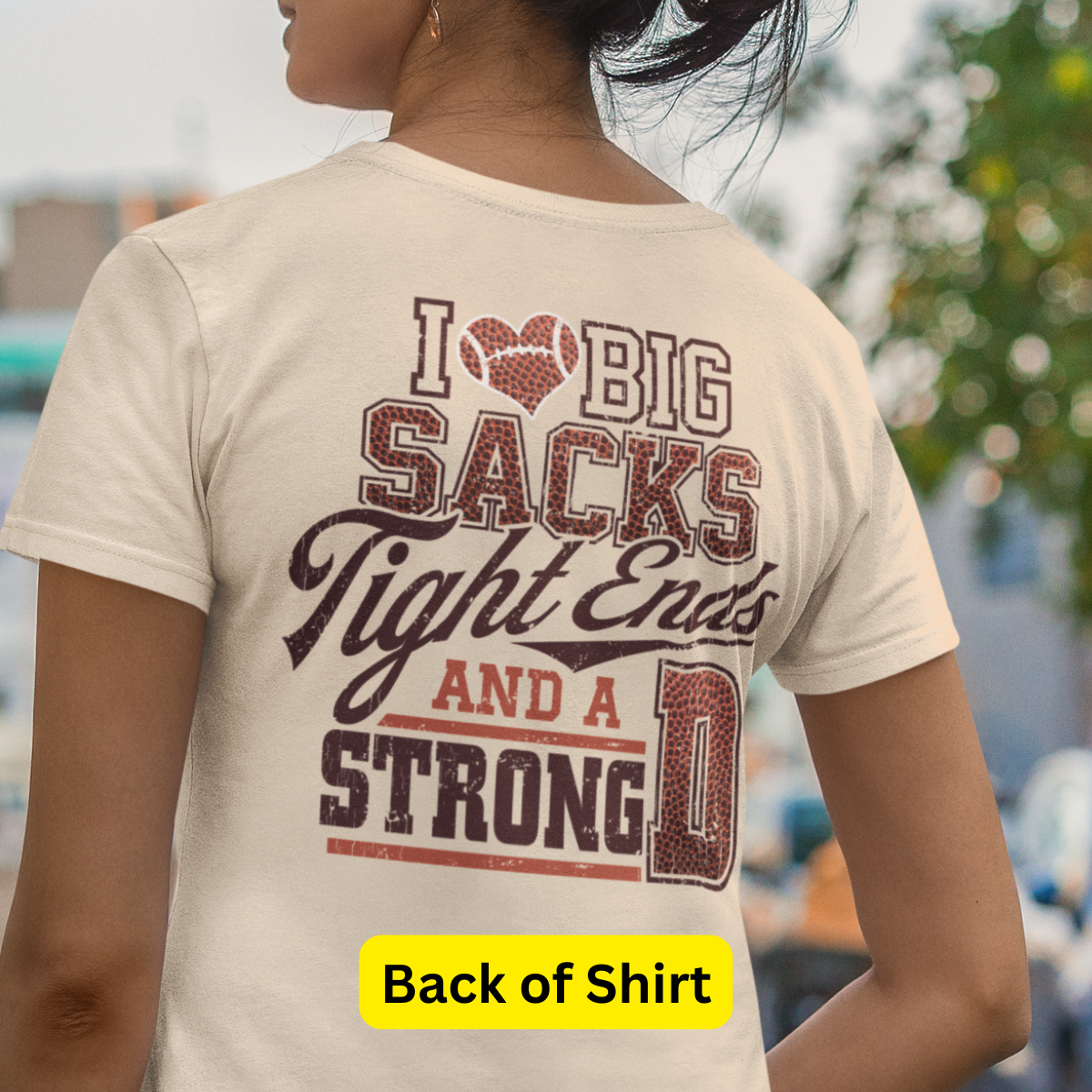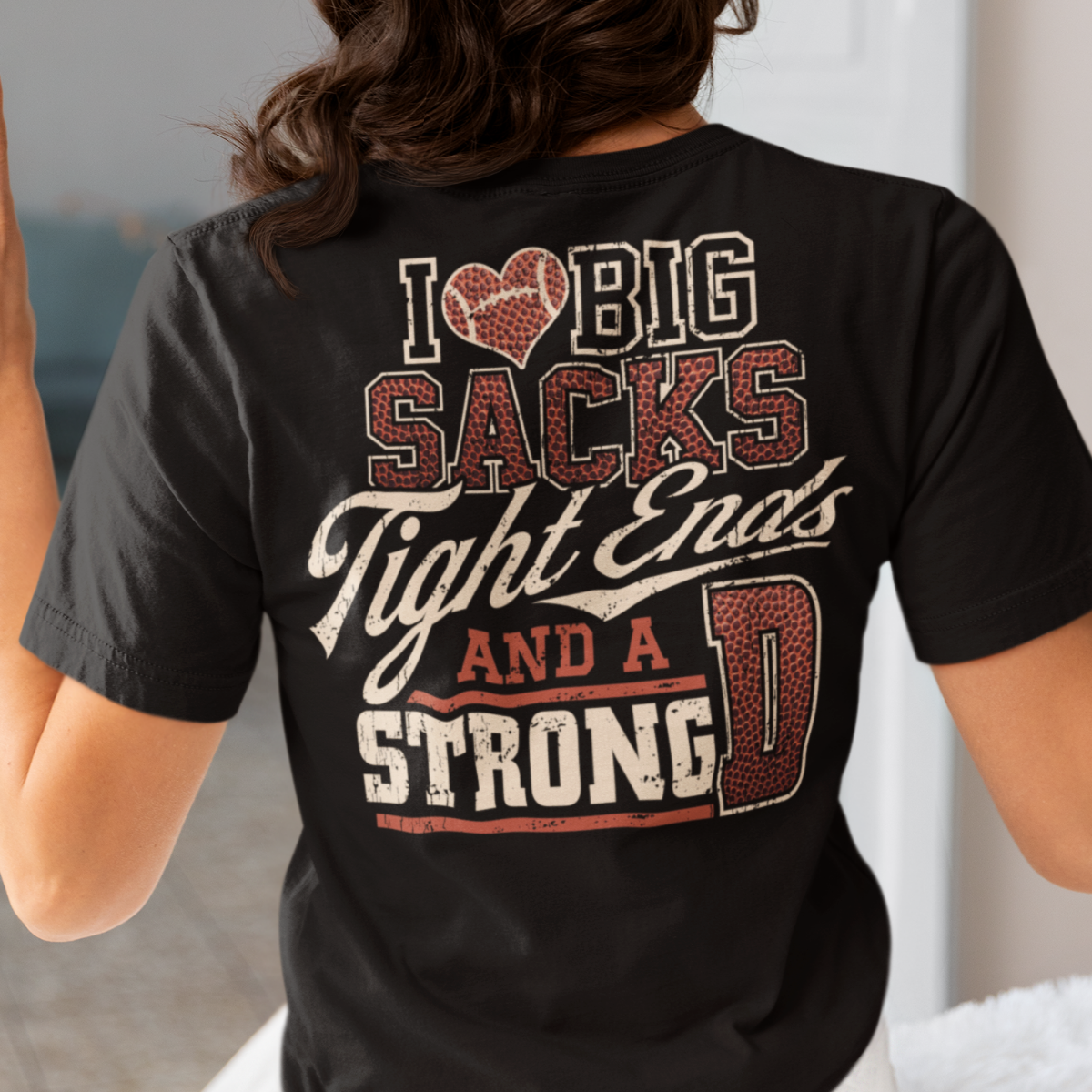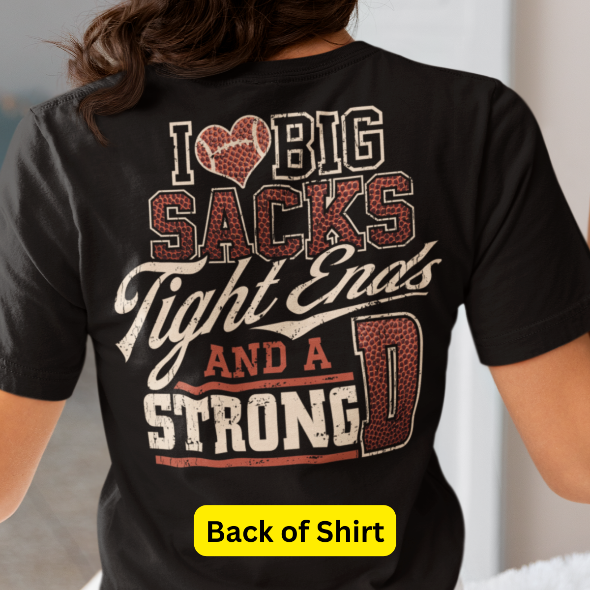 Show your football spirit with a shirt that’s as bold and playful as your love for the game. Order your "I Love Big Sacks, Tight Ends, & A Strong D" Football Shirt today and get ready to score in style!