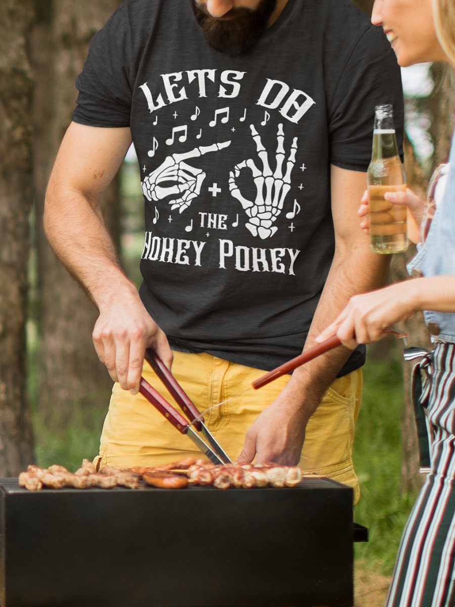 “Let’s Do The Hokey Pokey” isn’t just a playful invitation to dance; it’s a cheeky challenge to those who dare to embrace the unexpected. With its striking skeletal hands, this tee is perfect for those who walk on the wild side of life.