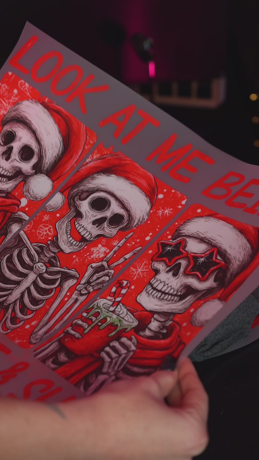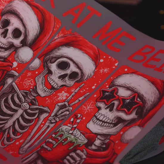 This hilarious Festive & Shit DTF transfer features three Christmas-ready skeletons living their best holiday life — scarves, Santa hats, star shades, candy cane drinks, and all. Bold red backgrounds and crisp linework make this an instant Christmas bestseller for boutique drops, vendor shows, and sarcastic holiday tees.