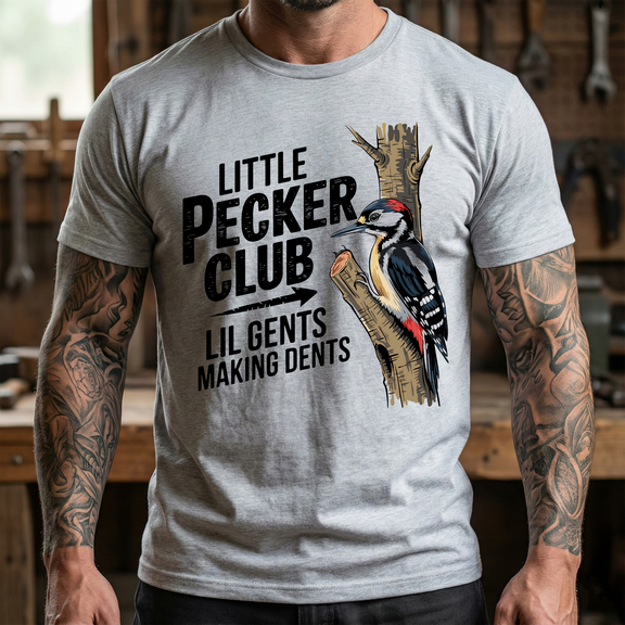 Join the elite ranks of the Little Pecker Club. This isn't just a shirt design; it's a support group for the tenacious. Featuring a beautifully illustrated, biologically accurate woodpecker (who is clearly working harder than everyone else), this transfer proudly displays the club motto: "LIL GENTS MAKING DENTS".