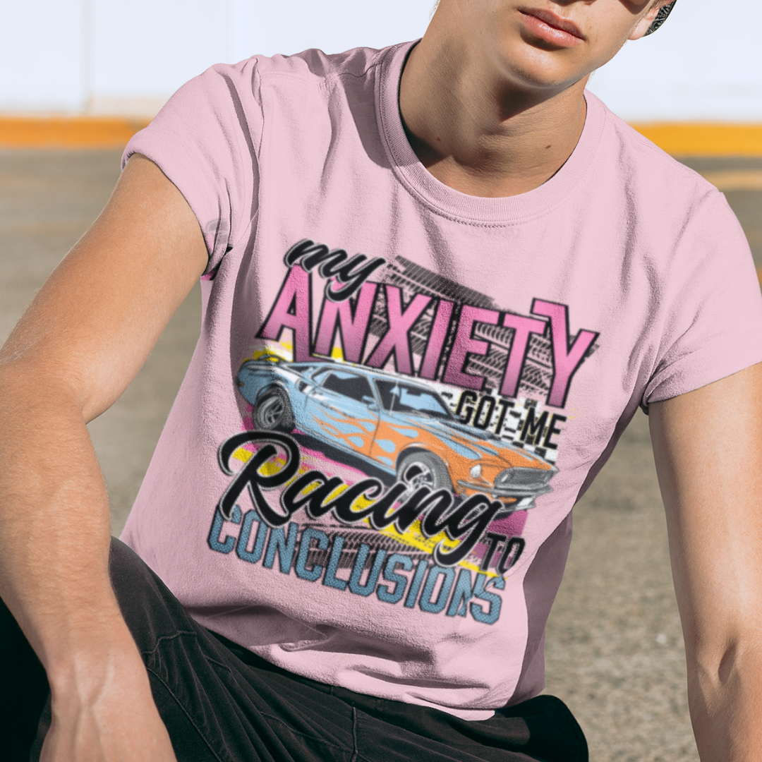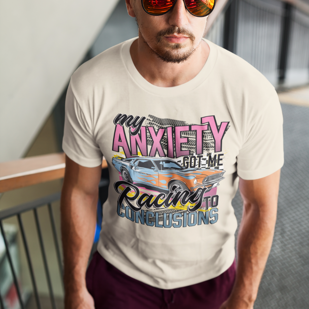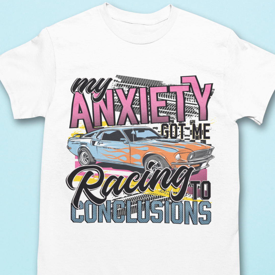 Own your overthinking with style. Order your "My Anxiety Got Me Racing To Conclusions" Shirt today and wear it with pride—because sometimes the fastest runner is your own mind!