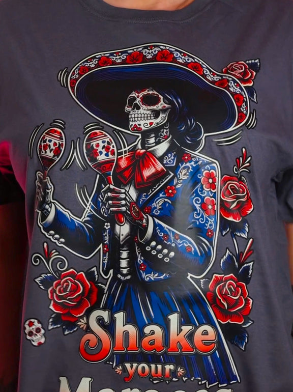 Featuring a beautifully detailed skeleton mariachi, bright maracas, embroidered-style florals, and deep vibrant colors, this tee is the perfect blend of spooky, festive, and fun.