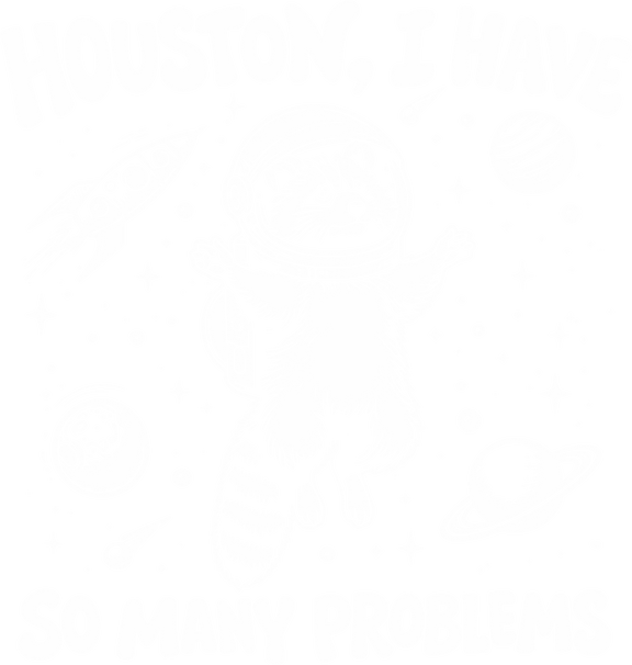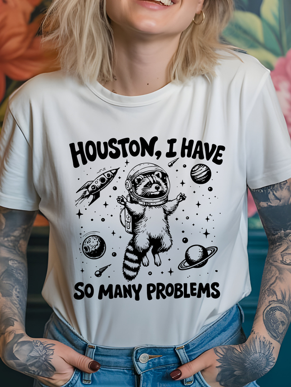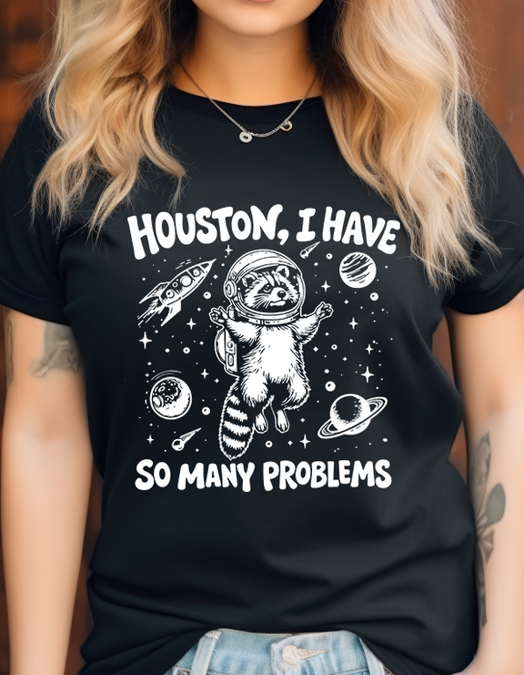 Relatable Humor: Features the hilariously blunt statement "HOUSTON, I HAVE SO MANY PROBLEMS" paired with a wide-eyed raccoon in a full space suit.