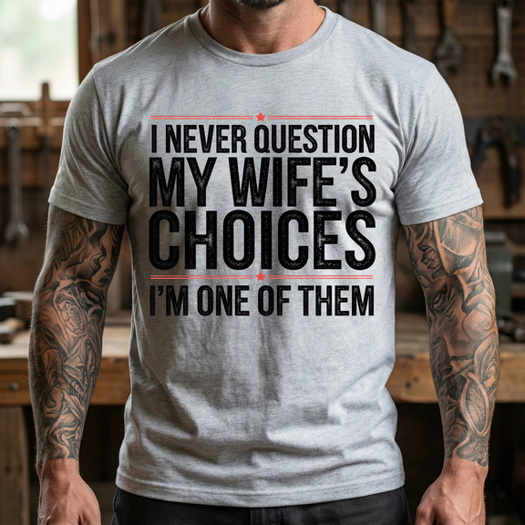 We present the ultimate logical failsafe: the "I Never Question My Wife's Choices" DTF transfer. This isn't just a shirt design; it is a tactical argument shield. The logic is circular and flawless: If you question her judgment, you are questioning her decision to marry you. Therefore, to insult her choices is to insult yourself. To compliment her choices is to compliment yourself.