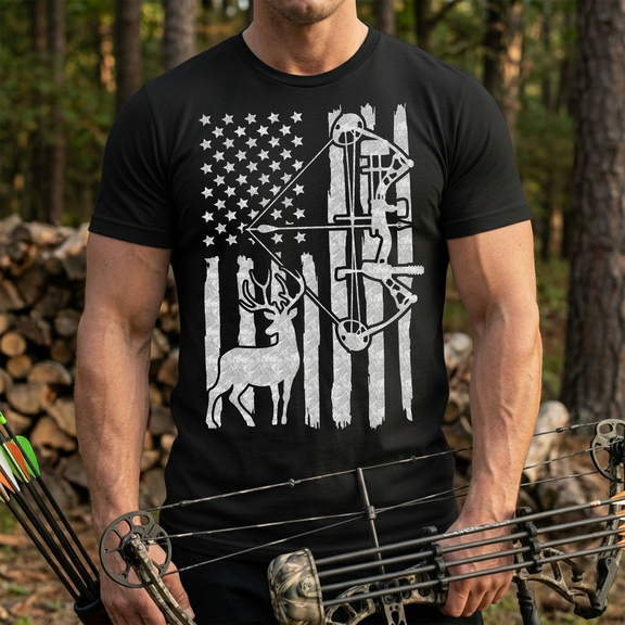 This is the USA Flag Bow Hunter DTF transfer. It strips away the noise and leaves only the essentials: The Flag, The Buck, and The Bow. Rendered in a stark, tactical black, this design features a distressed American flag backdrop that serves as the terrain for a silhouette of a trophy buck and a modern compound bow.