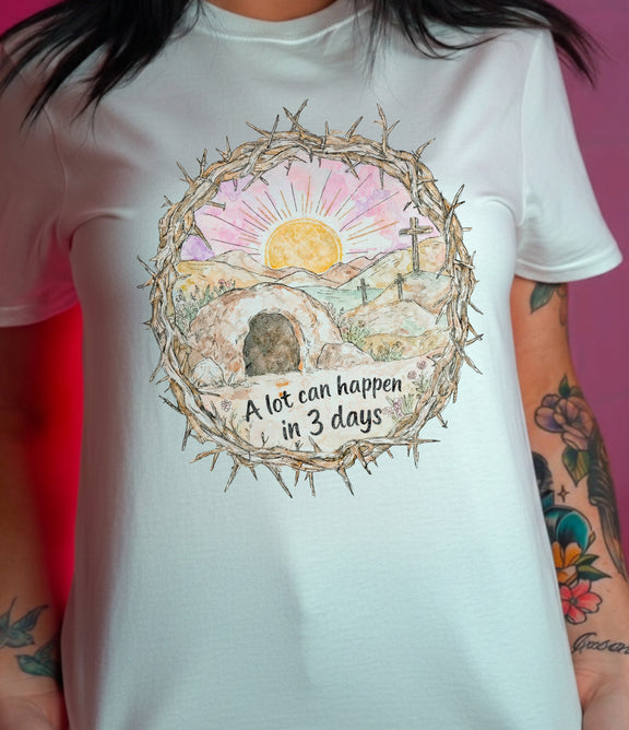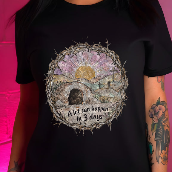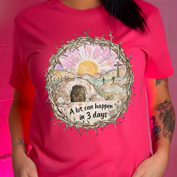 Powerful Faith Message: Features the poignant phrase "A lot can happen in 3 days," perfectly capturing the hope and true meaning of the Easter season.
