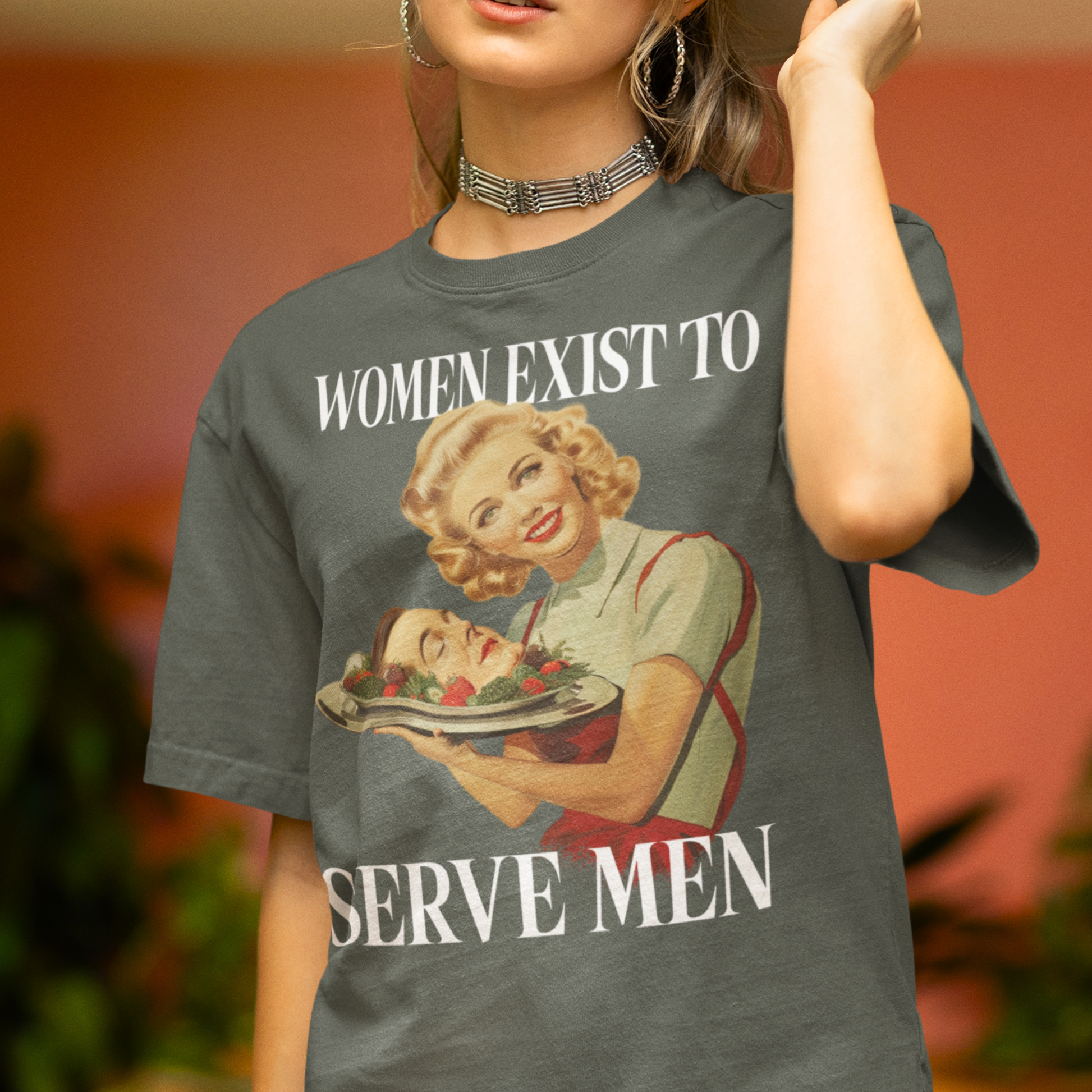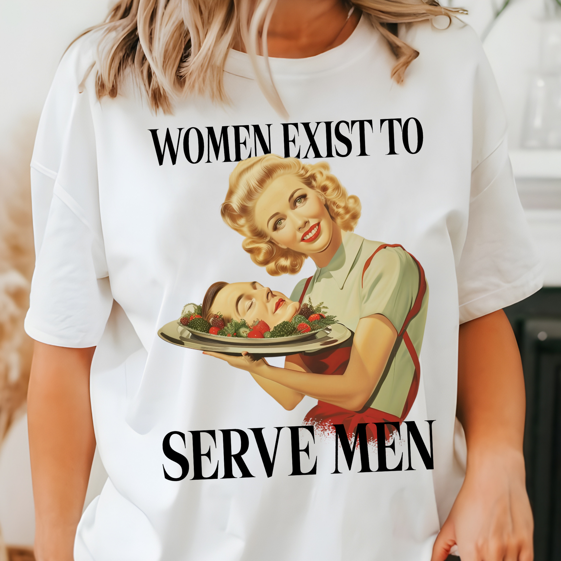 - Clever and Bold Design: "Women Exist to Serve Men" paired with the image of a woman serving a man's head – it's dark, witty, and guaranteed to get reactions.